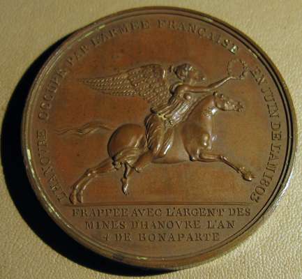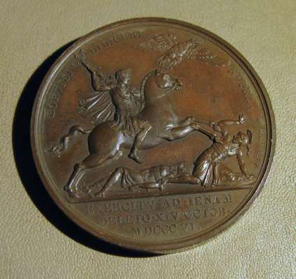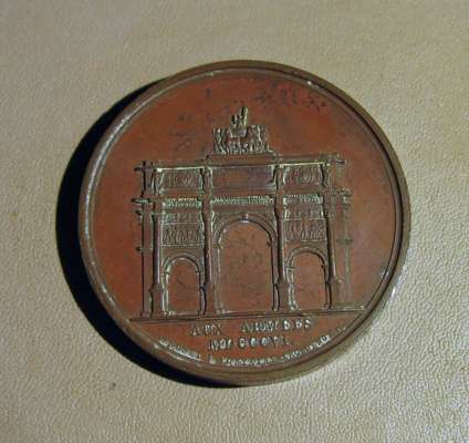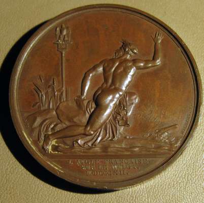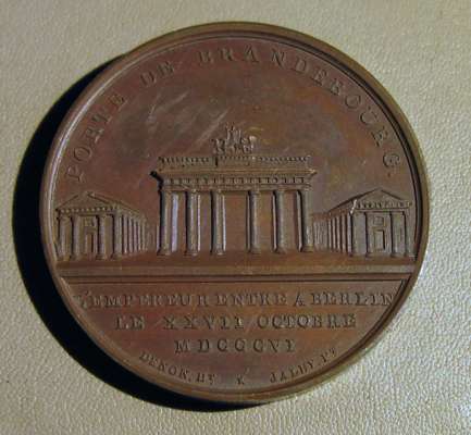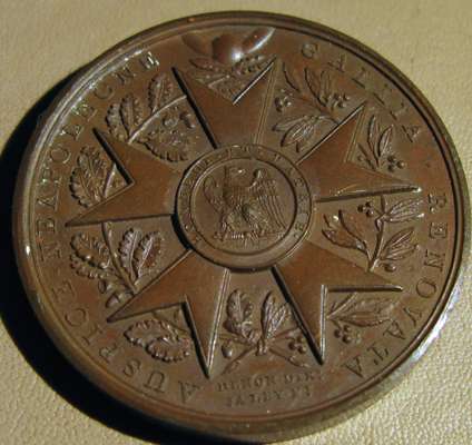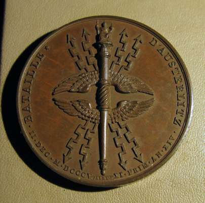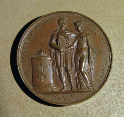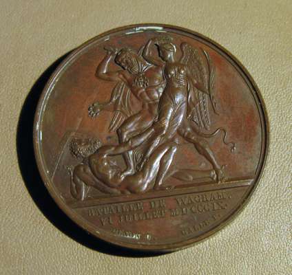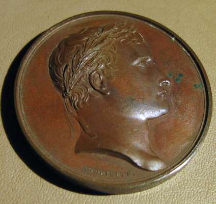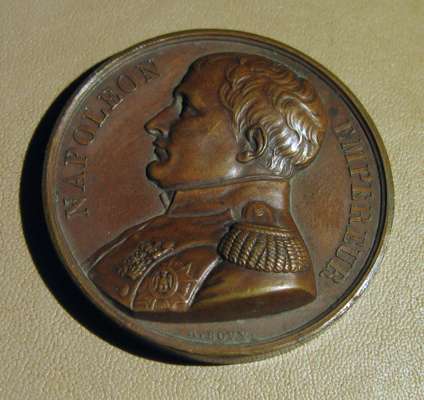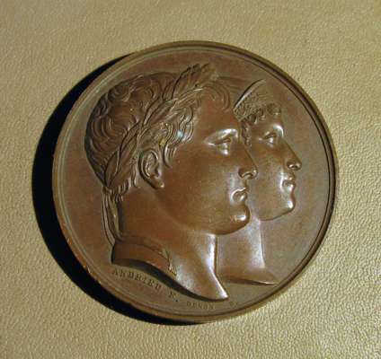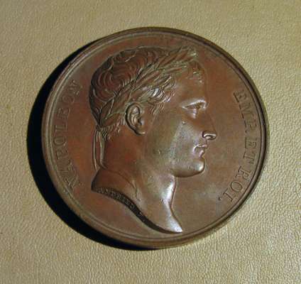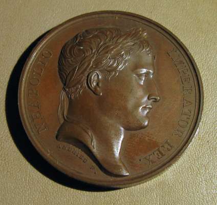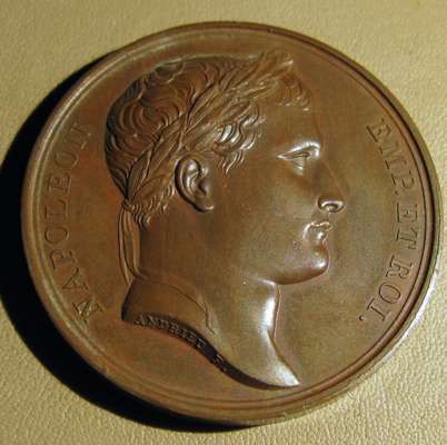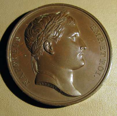 to include: Capitulation of Ulm & Meningen, Napoleon Bonaparte (Emperor Napoleon I), France, 1805; Napoleon bronze "St. Helena Memorial" Medal 1840; France 1804 Napoleon Legion d'honneur Bronze Medal - By Andrieu; Napoleon Le Grand Arc De Letoile bronze medallion; Marriage of Napoleon, Napoleon Bonaparte (Emperor Napoleon I), France, 1810; Napoleon medal, The Battle of Wagram, Andrieu. 1809; Medal- Napoleon entry in Berlin 27 October 1806, By Andrieu and Jaley; 1803 The Treaty of Amiens; Napoleon, Medal 1807, French Army Crossing the Volga; Napoelon I, Emperor, 1804-1814, 1812, "Entry into Moscow" by Jean-Bertrand Andrieu; a larger medal, 50mm, 1800 Napoleon's Battle of Marengo Medal - Bronze, designer marked "BRENET" at the base of the bust and engraver marked "H. AUGUSTE"; Bronze Medal 1804 (Ø34.5mm, 20.4g) by Andrieu & Denon, Napoleon Bonaparte Museum; Bronze medal (31mm) commemorating the slaughter of 3,000 Huguenots in Paris on St. Bartholomew's Day (August 23-24) in 1572.