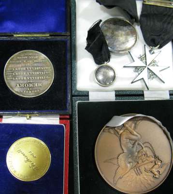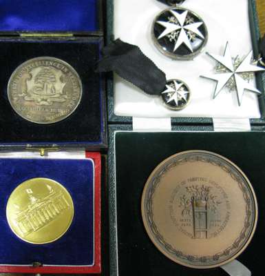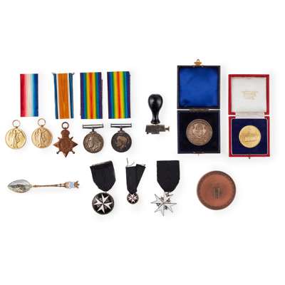 a 9ct gold medal for RSA, medal for Architecture to J E Arnott 1981 (28g); Order of St. John two medals and miniature; AVM., BWM., 1914-15 star to Pte. J L Walker S-17713 Cameron Highlanders; AVM., BWM., to R.M.A. 2782 -S- GR.2 A. Walker; silver medal for excellence in needlework to Miss Lizzie Emslie Galashiels 1902 (cased); an enamel spoon; RSA to Ian Arnott elected associate 1887