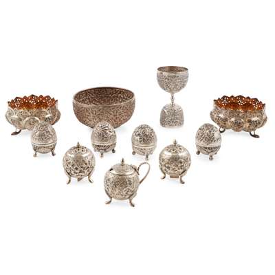 to include a double ended jigger, a pair of bon bon dishes with gilt interior, a sugar basin and a collection of condiments, all with embossed foliate and fauna depictions including elephants, tigers, birds etc.