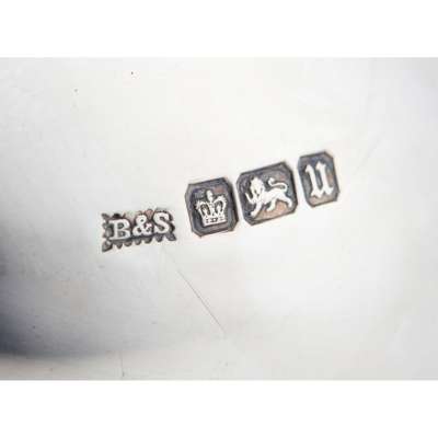 Brook and Son, Sheffield 1912, of traditional oval baluster form, the everted rim of threaded moulded form, engraved italic M to centre of body, each raised on four similarly decorative moulded legs