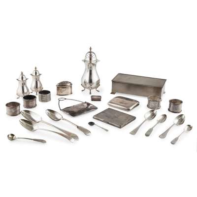 to include a cased matched set of condiments, Chester 1906, each with cast gadrooned border, retailed by Edward and Son; a sugar caster, Birmingham 1919, of traditional form; together with a cigarette box, cigarette cases, napkin rings,etc and a collection of flatware