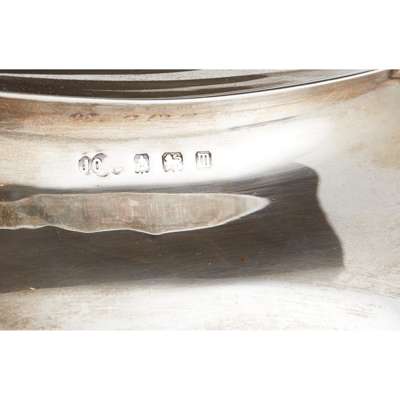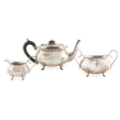 Joseph Gloster Ltd, Birmingham 1911, comprising teapot, twin handled sugar basin and milk jug, all of oval form baluster form with everted rims, S scroll handles, each raised on four scallop clasped legs