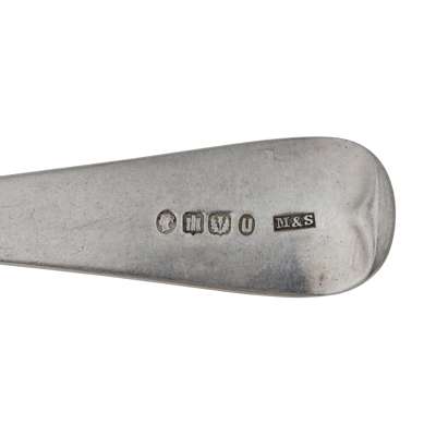 Marshall & Sons, Edinburgh 1876, of Old English pattern, bright cut engraving to stem with Fraser crest and motto engraved to terminal; together with a cased set of open salts and spoons, William Marshall, Edinburgh 1880, of Indian style round form, with embossed scroll and floral decoration
