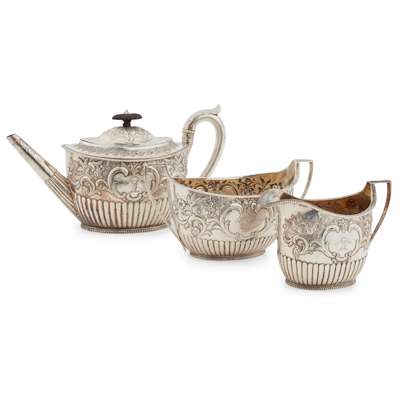 McHattie and Fenwick, Edinburgh 1802, the oval teapot with embossed band of floral decoration, and demi ribbed, matching sugar and cream, gadroon borders, engraved Fraser crest and motto to one cartouche and ornate monogram to the other