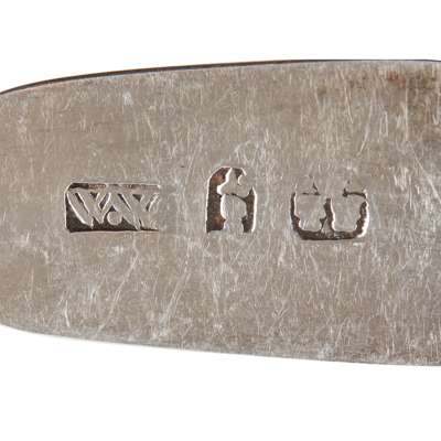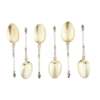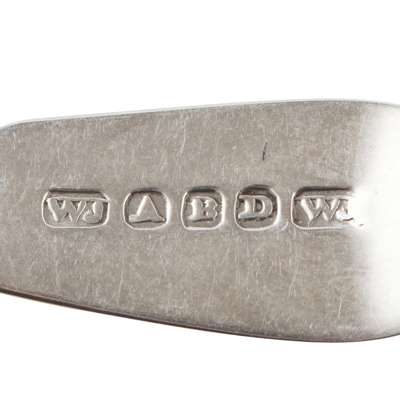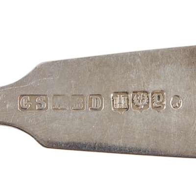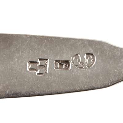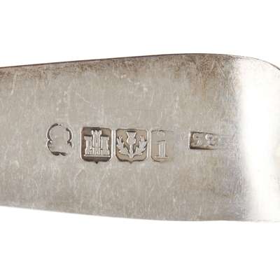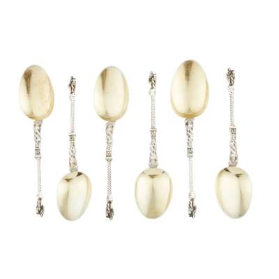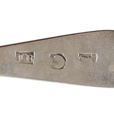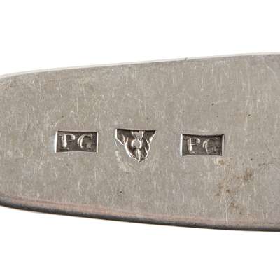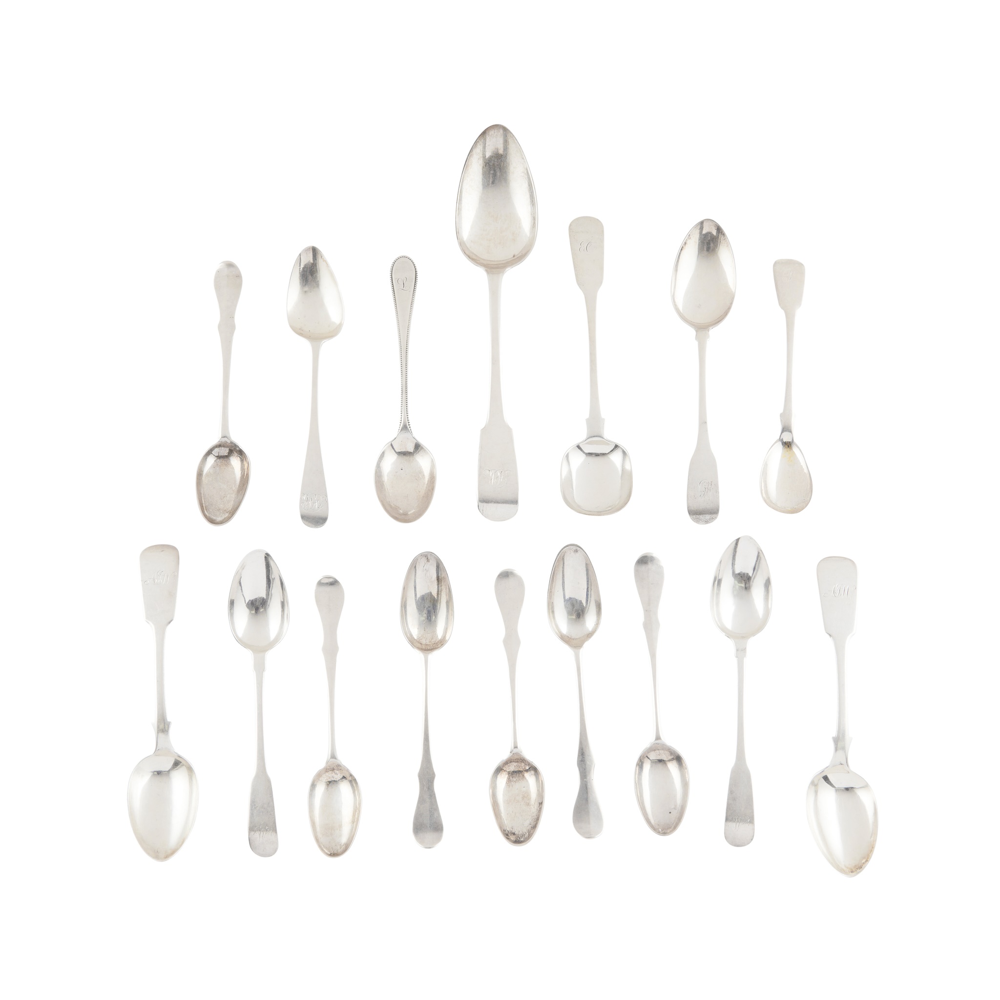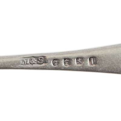 to include Aberdeen, a sugar shovel, Peter Gill, of Fiddle pattern; a set of six 18th century small teaspoons, indistinct maker's mark, Scottish fiddle pattern; George Sangster, two fiddle pattern teaspoons; others by Leslie, Booth, Jamieson etc. and a Scottish provincial horn beaker, William Milne, marked MILNE, ABERDEEN, the tapered horn beaker with silver applied rim and shield cartouche; together with a set of six Victorian ornate apostle dessert spoons, Martin and Hall, Sheffield 1883, the finials of the same apostle, on square platform, wrythen stem to cast figural panel of figure holing grapes, shaped gilt bowl