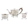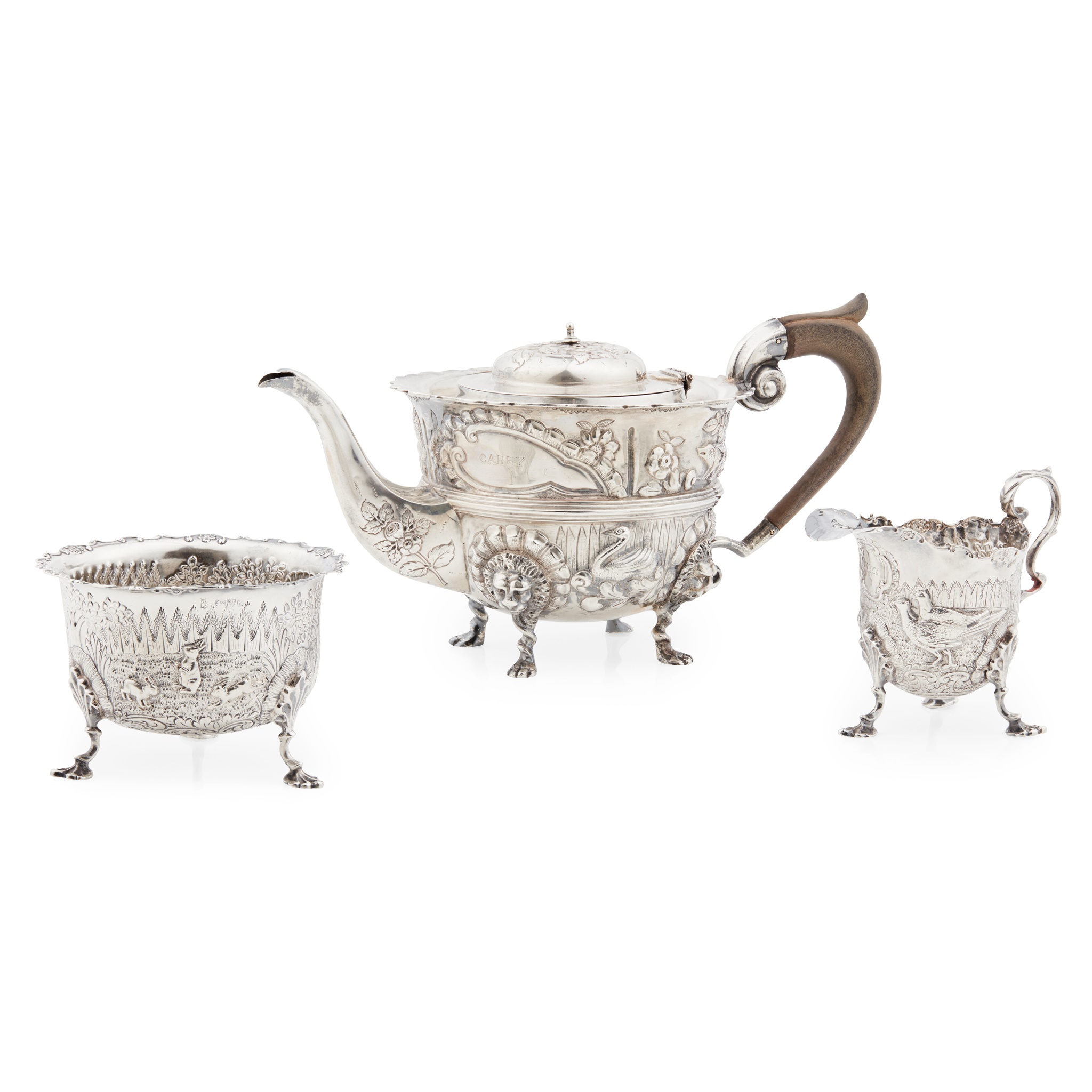 George Nathan & Ridley Hayes, Chester 1901, 1903, comprising a teapot, sugar basin and milk jug, all of circular form, the everted rims of moulded scroll form, with heavily embossed decoration throughout of naturalistic depictions including swans, pheasants, hare, etc, engraved central cartouche, S scroll handles, the teapot raised on four lion mask clasped legs to paw feet and the sugar basin and milk jug raised on shell feet