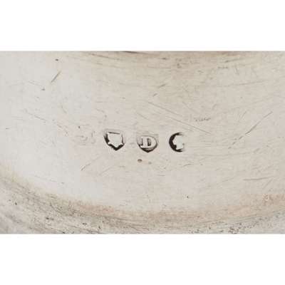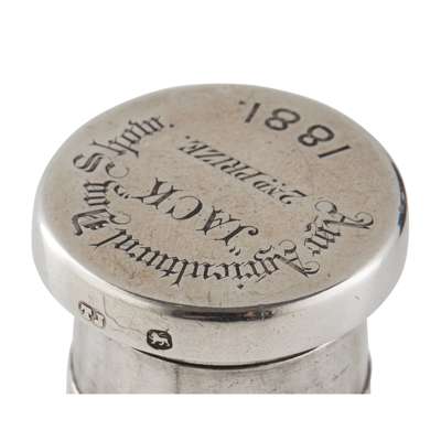 Thomas Johnson, London 1879, of traditional form, curved shoulders, lid acting as a telescopic cup with presentation engraving to lid 'JACK/ 2nd PRIZE/ 1881'