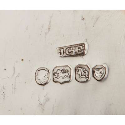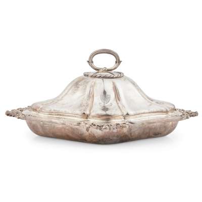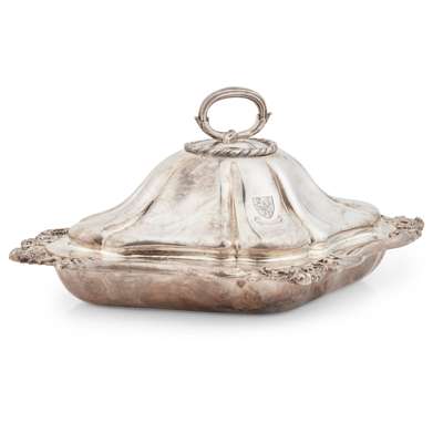 James Charles Edington, London 1843, of moulded quatrefoil form, the dish with a cast acanthus border, engraved griffin to either side of rim, the lid of of domed melon form, engraved armorial and motto 'TRUST AND FEAR NOT' to either side of body, the loop hand with rope twist border
