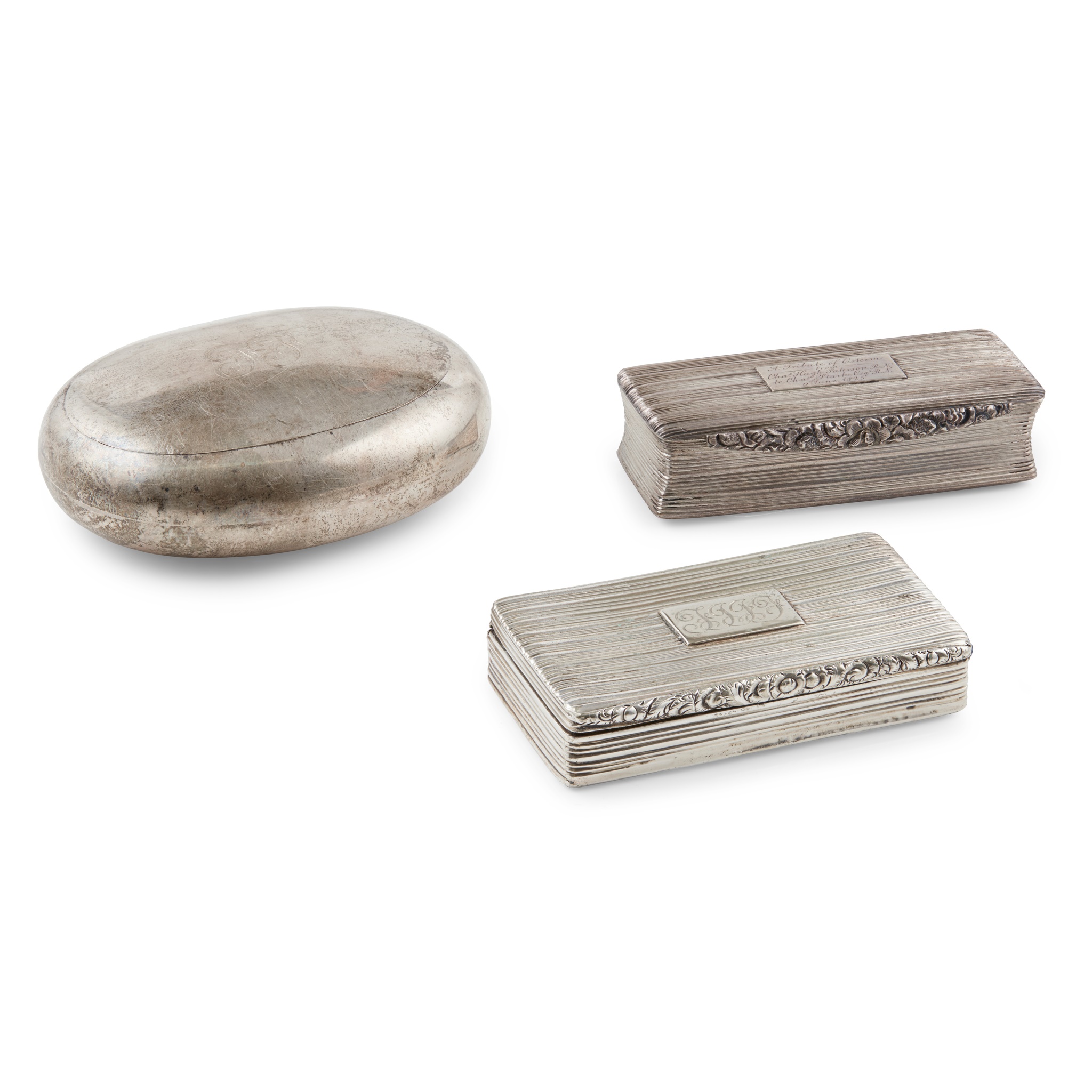 T.S, Birmingham 1824, of rectangular outline, threaded detail throughout, rectangular cartouche to hinged lid, engraved 'A Tribute of Esteem/from/ ...1825' foliate thumbpiece; together with another similar and an oval snuff box, both engraved with initials to the hinged lid, and a small vesta case of disc form