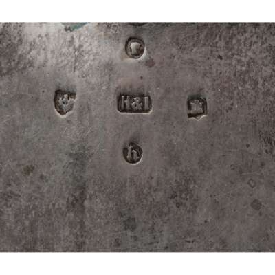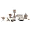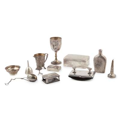 EM possibly Edward Mayfield, London 1808, of traditional form with threaded borders; together with a trophy, Robert Pringle & Sons, Chester 1909; a Victorian hip flask, Birmingham 1864, with allover foliate engraved decoration and screw off lid; a table cigarette box, cigarette case and cover; together with a stamp box/blotter, Victorian tea infuser, jug etc.