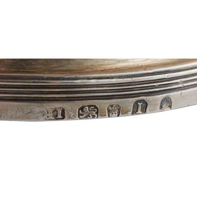 John Robins (possibly) London 1804, of Neo-Classical circular form, Greek key border with engraved foliate decoration, the stand with three threaded legs to paw feet, plain spirit burner