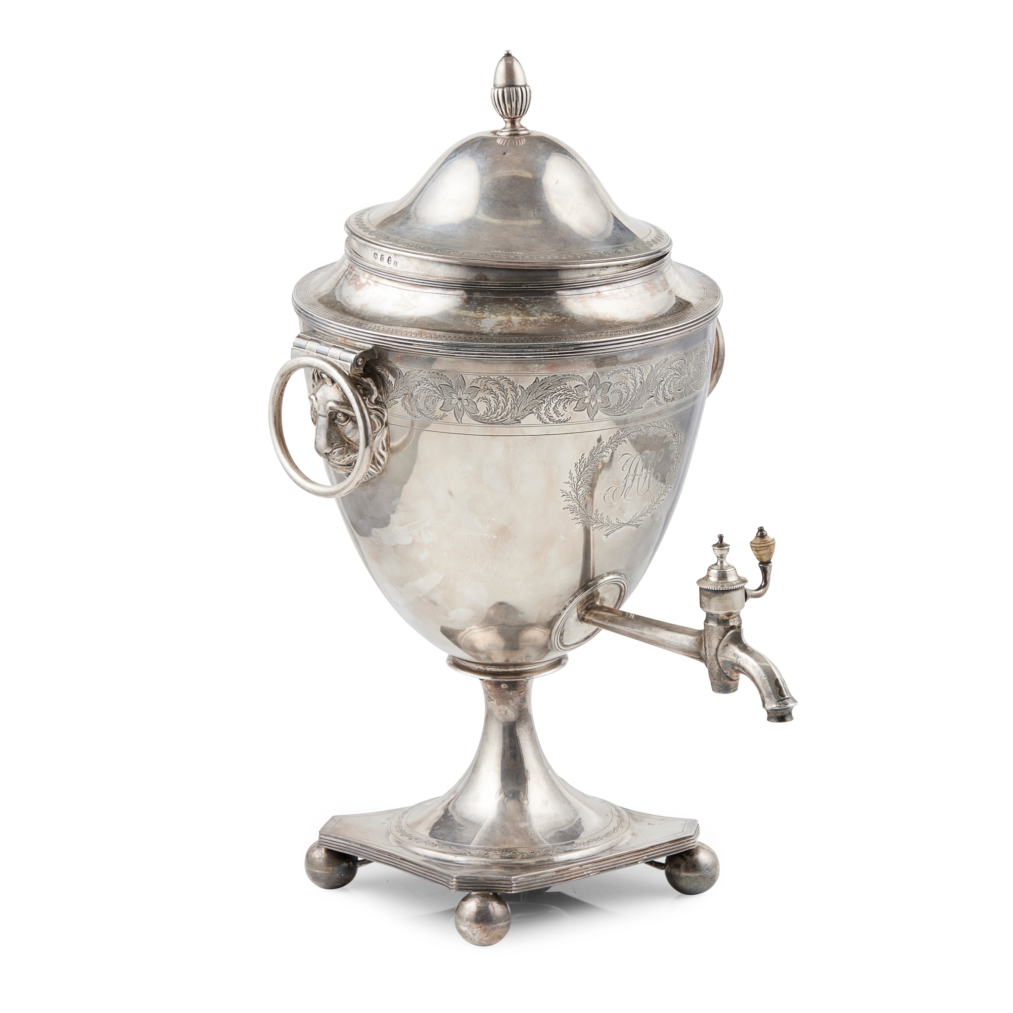 John Emes, London 1801, of twin loop handled urn form, with engraved floral borders and lion mask capped handles, wreath cartouche to centre with foliate IHH to centre, the moulded square pedestal base on four bun feet, with fitted interior, the pull off lid of domed form with acorn finial revealing central holder for hot bar