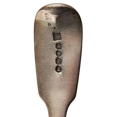 to include a George III basting spoon, Robert Gray, Edinburgh 1797, of Old English pattern, engraved initials to terminal; a set of five tablespoons, Morris & Michael Emanuel, London 1830, of Fiddle pattern; together with a cream jug, various teaspoons, napkin rings and ashtrays; together with a collection of plated flatware, condiments, napkin rings and a plated entrée dish