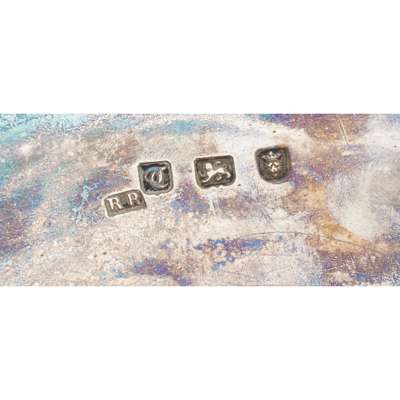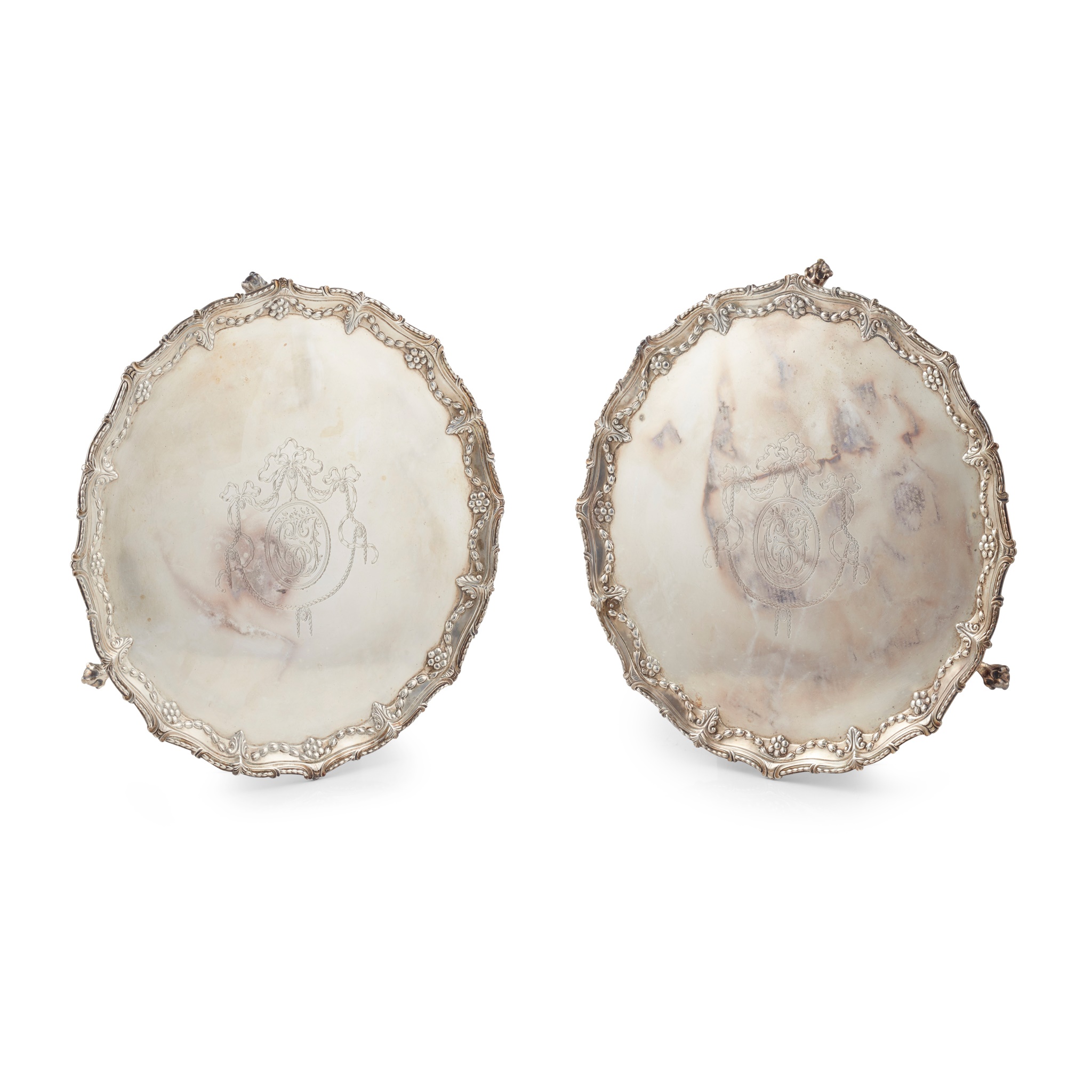 Richard Rugg II, London 1777 and 1774, of moulded circular form, the cast border with floral swag decoration, the centre engraved with ornate oval cartouche with swags and bows, foliate initials the centre, raised on three ball and claw feet
