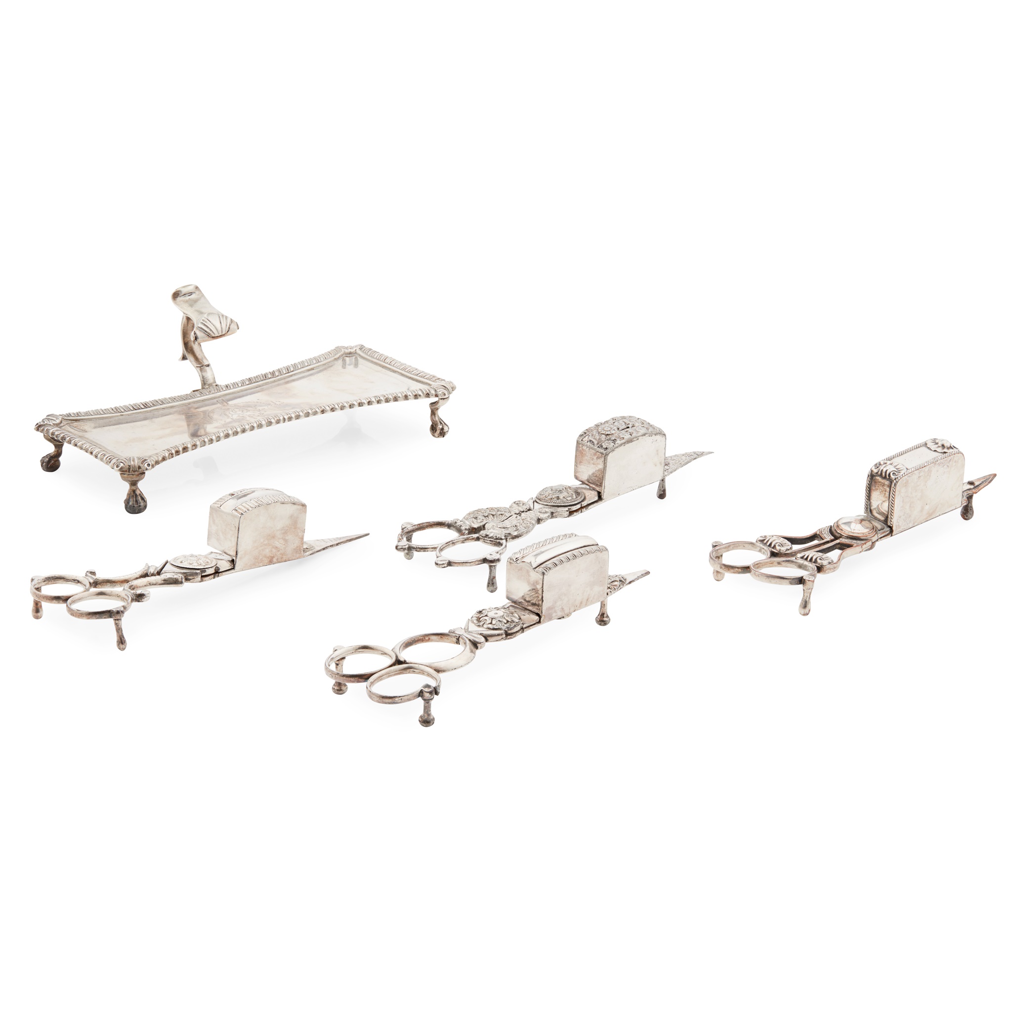 William Cafe, London 1767, of waisted rectangular form with gadrooned border and foliate initials engraved to centre, a shell clasped scroll handle and raised on four claw and ball feet; together with a pair of wick trimmers, two pairs of plated wick trimmers and another similar white metal pair