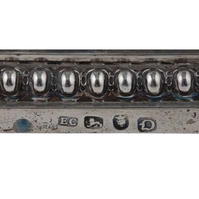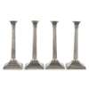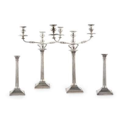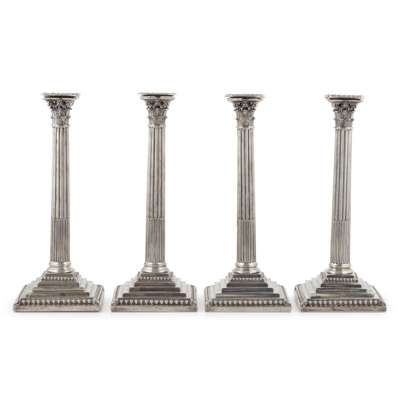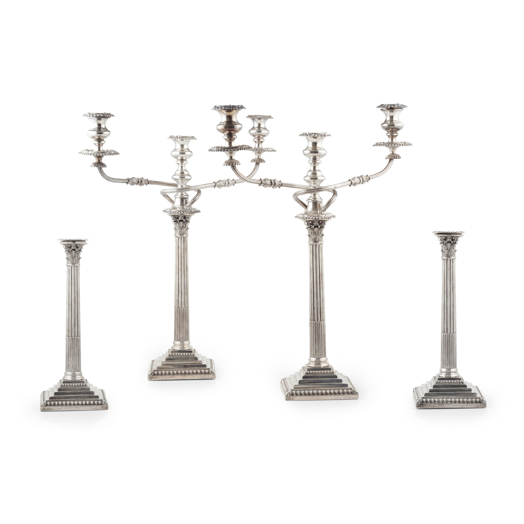 Ebenezer Coker, London 1769, each of traditional Corinthian form, the slightly tapered reeded columns to a stepped square base with embossed bead decoration and leaf clasped corners, the initials CJ engraved to middle step, the pull off sconce with similar decoration and foliate engraved initials, (loaded); together with a pair of plated two scroll branch candelabra fittings (associated)