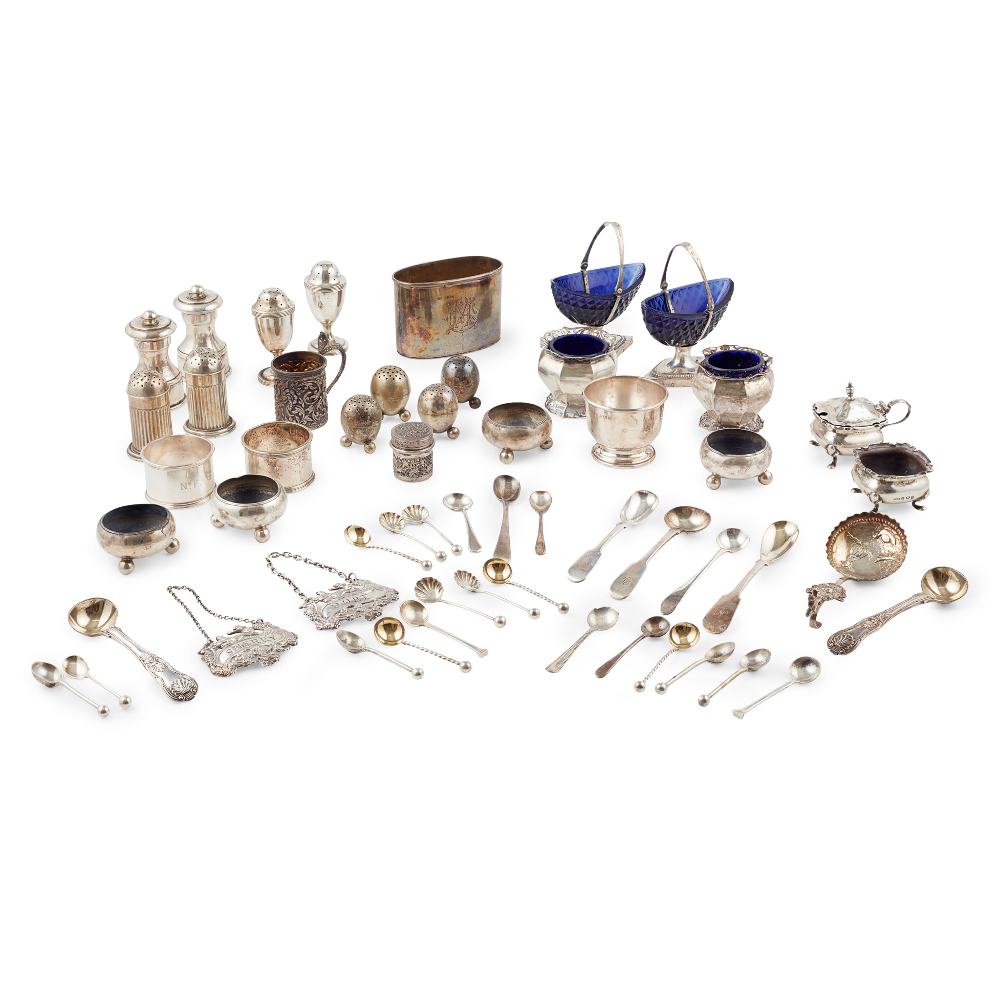 to include, a set of four open salts on three bun feet; a pair of cut-glass oval salts and various condiment spoons; together with modern silver pepper mills, various napkin rings and two stamped wine labels one for port and the other for sherry