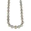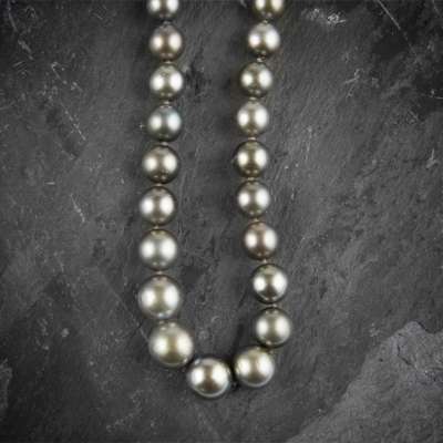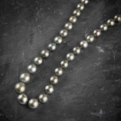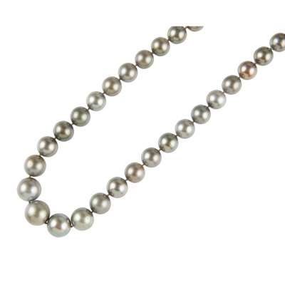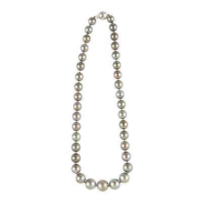 composed of a single strand of Tahitian pearls, to an 18ct white gold ball clasp, gypsy set with a row of eight-cut diamonds