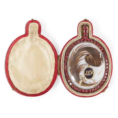 of oval outline, the central hair motif with seed pearl and enamel panel detail, the whole in a border of round-cut garnets, unmarked, in a fitted red leather case