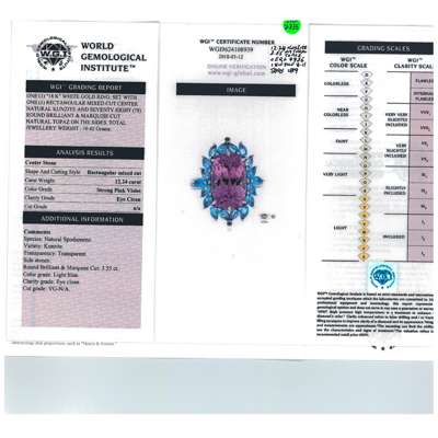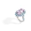 claw set with a rectangular mixed-cut kunzite, in a border of marquise-cut blue topaz, each shoulder set with small round-cut blue topaz, to a plain shank marked '18ct gold (750) David Jerome'; with accompanying report by World Gemmological Institute, dated 12.03.2018, numbered WGI9624108939, stating that the kunzite and topaz are of natural origin