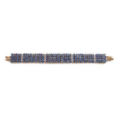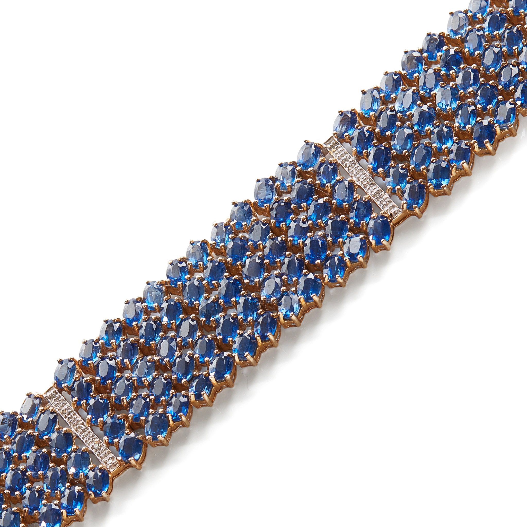 modelled in 9ct gold, composed of five rows of forty-two oval-cut blue Kyanites, between four eight-cut diamond set spacers, to a plain fold over clasp