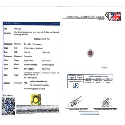 claw set with an oval-cut pink sapphire in a double border of round brilliant-cut diamonds, to a plain shank, unmarked; with accompanying report by Gemmological Certification Services, dated 13.01.2021, numbered 81292-79, stating that the sapphire is of Sri Lankan origin, showing no signs of heat treatment