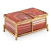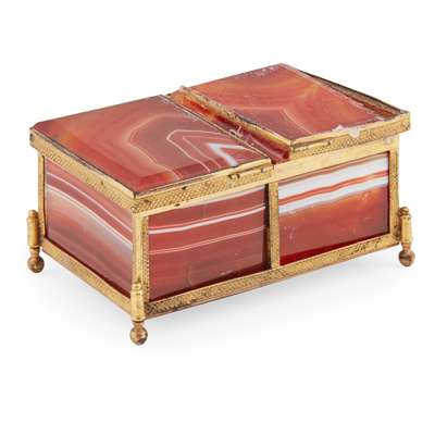 circa 1870, engine turned cylindrical case, pull-off cover, enclosing three glass bottles a/f; a pair of mid-19th century gilt lorgnettes, engraved decoration, silk suspension; a group of WWI silk patches decorated with various all world flags; a well made mid-19th century bow brooch, gilt metal mounts, woven hair; a silver bracelet with three silver coins; a 19th century gilt metal framed box and cover, the frame enclosing bevelled agate panels, double section interior