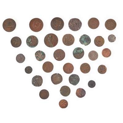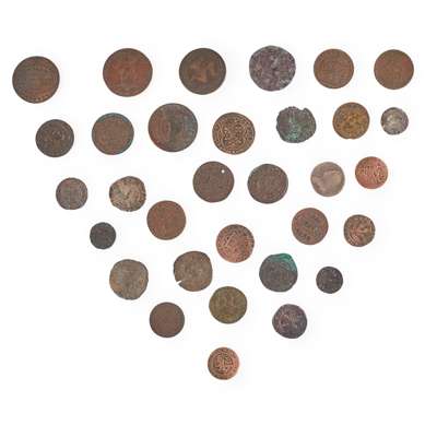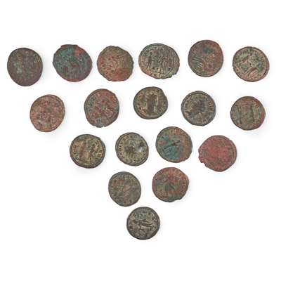 to include; a group of fifteen bronze Roman coins, Postumus and similar period; various hammered silver coins, bronze coins from England, Scotland, Isle of Man and other European countries; a quantity of various bronze and other coins (Poor condition); a 19th century hand written list of coins on various pages