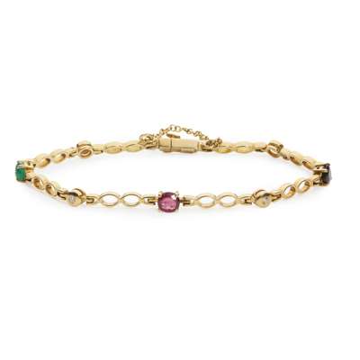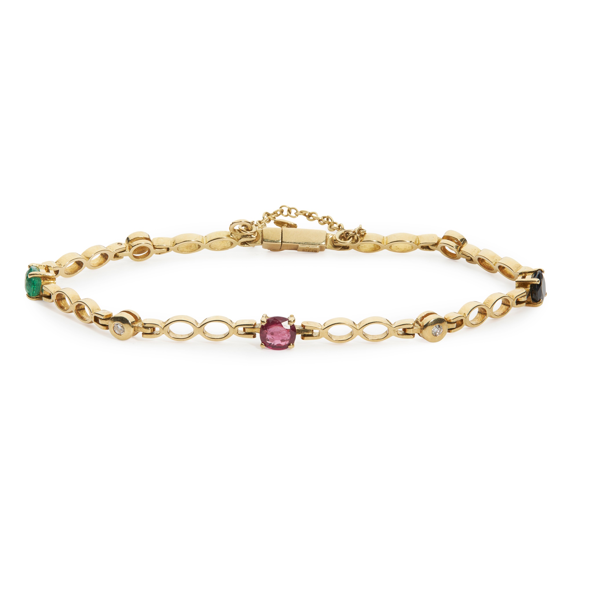 the links set at intervals with an oval-cut ruby, sapphire and emerald and collet set round brilliant-cut diamonds, stamped 18k