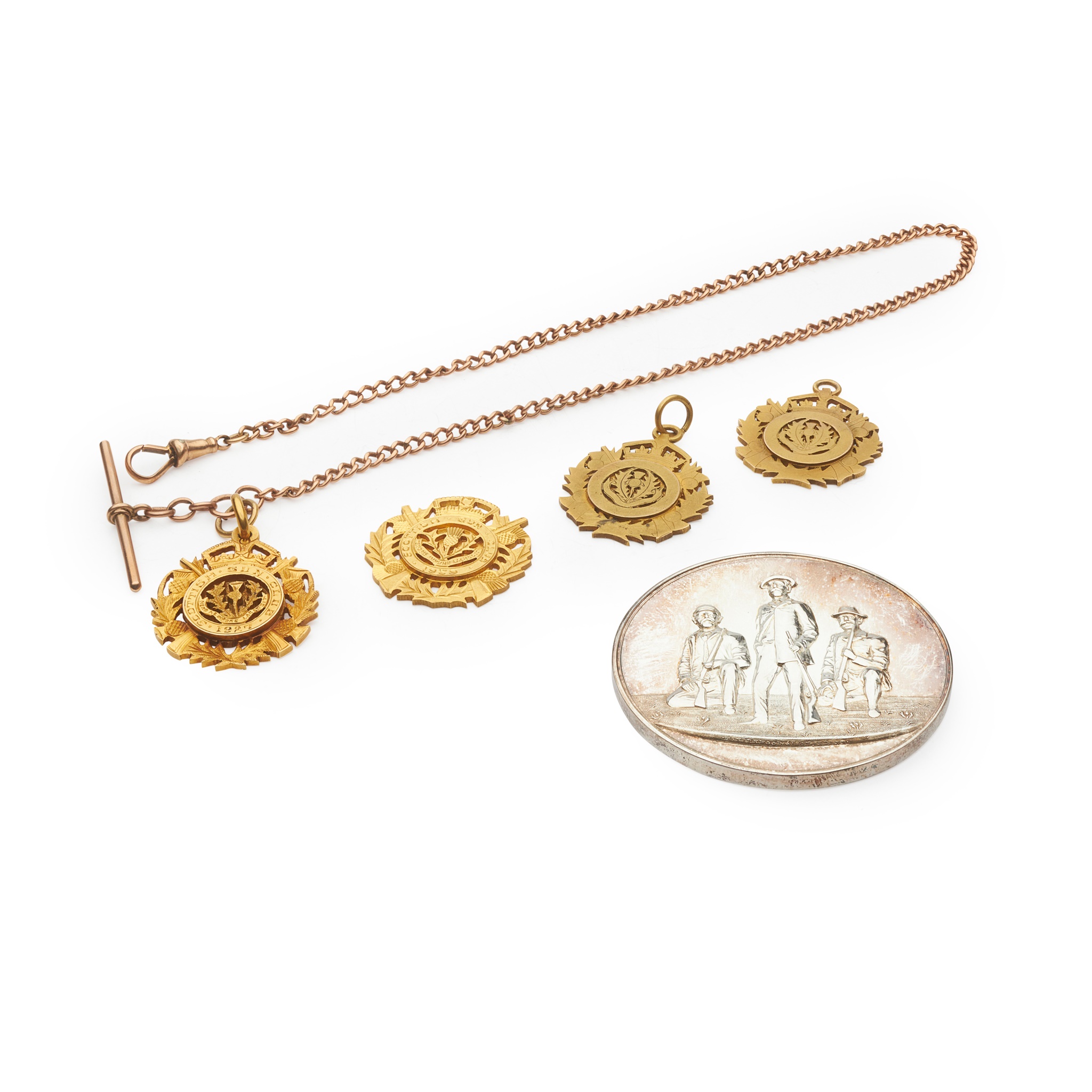 to include three 9ct gold medals, and another stamped 15ct, an unmarked Albert chain; together with a silver medallion with presentation engraving to reverse 'P. C. MACDONALD/ 50 years membership of the gun club