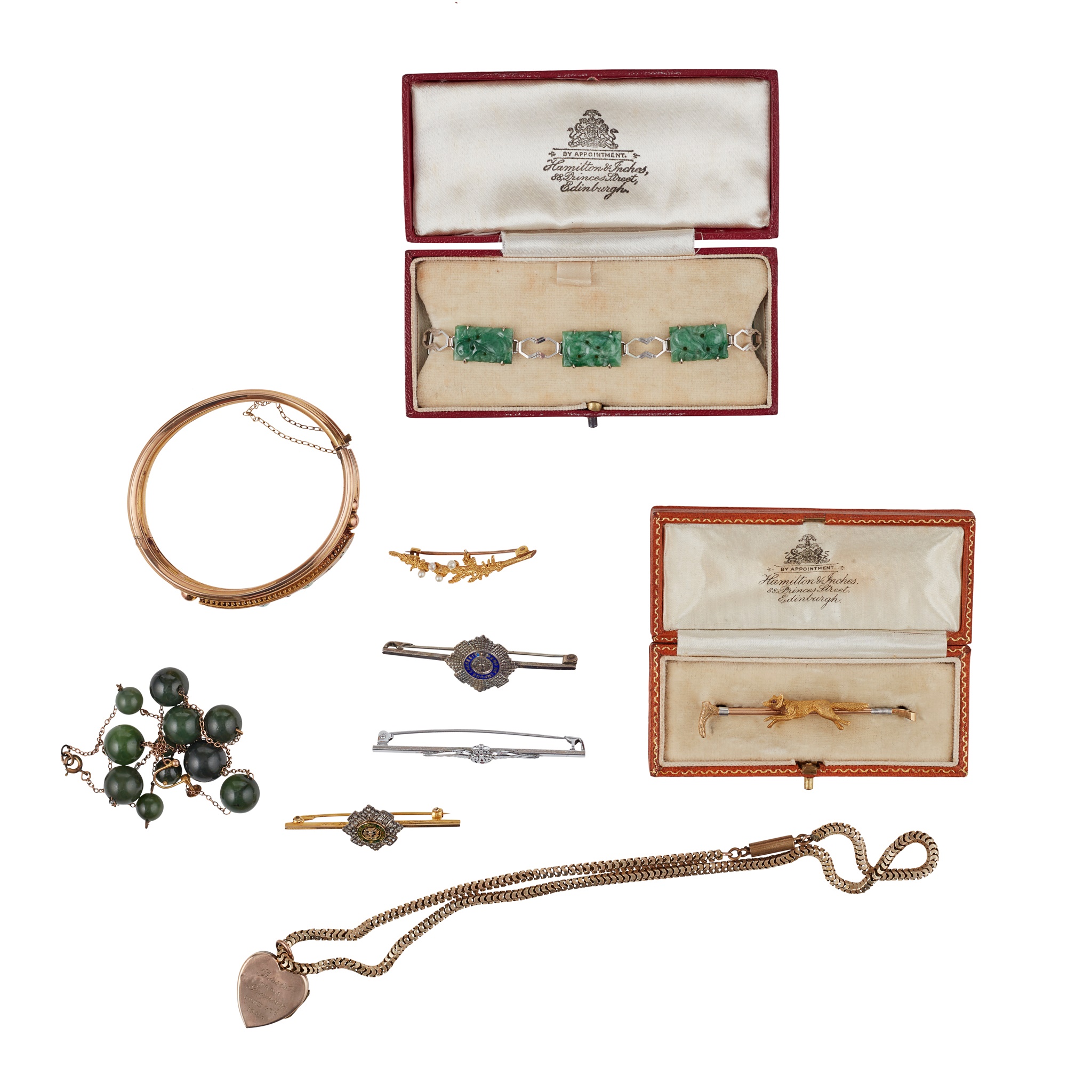 to include a bar brooch with applied fox motif, stamped 15ct, a hinged opal and diamond set bangle, indistinctly marked; a 9ct gold enamel and diamond set regimental sweetheart brooch, a hardstone bead necklace; a sapphire and pearl locket, a seed pearl set brooch; a carved jade bracelet and two further regimental brooches