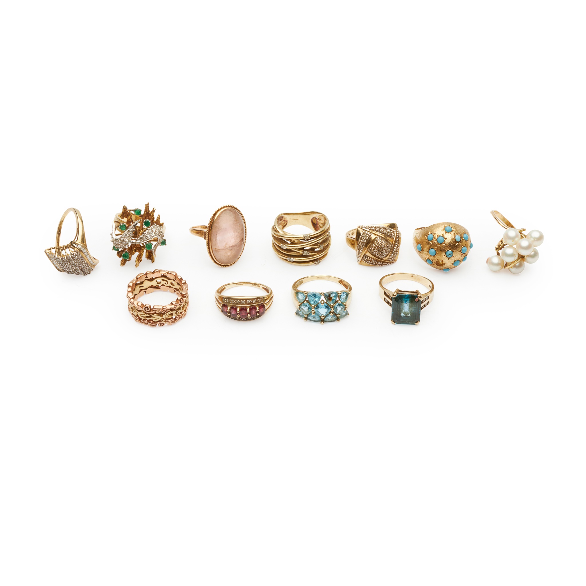 to include two 9ct gold diamond set cluster rings, a 9ct gold broad band set with small round-cut diamonds; a bi-coloured 9ct gold ring and three further 9ct gold gem-set rings; a pearl cluster ring and an emerald and diamond set cluster ring, both stamped 14k, a turquoise bombé ring, stamped 18k and a cabochon rose quartz ring, unmarked