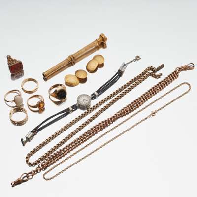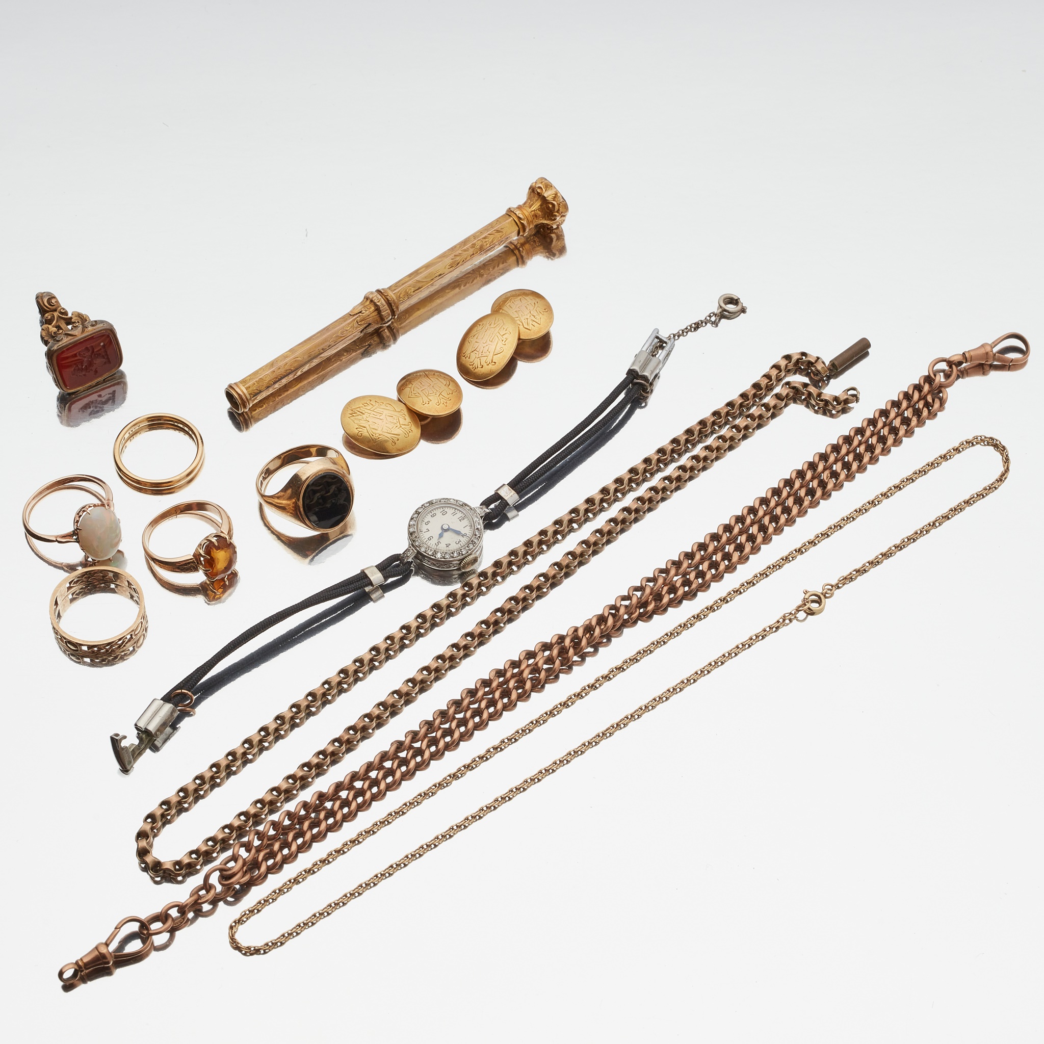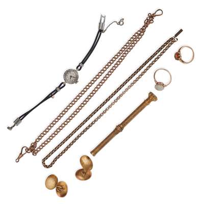 to include a single stone opal set ring, to an unmarked shank; a citrine set ring, stamped 15ct; a 9ct gold watch chain, a pair of cufflinks stamped 15ct; a diamond set cocktail watch; a propelling pencil and an unmarked chain