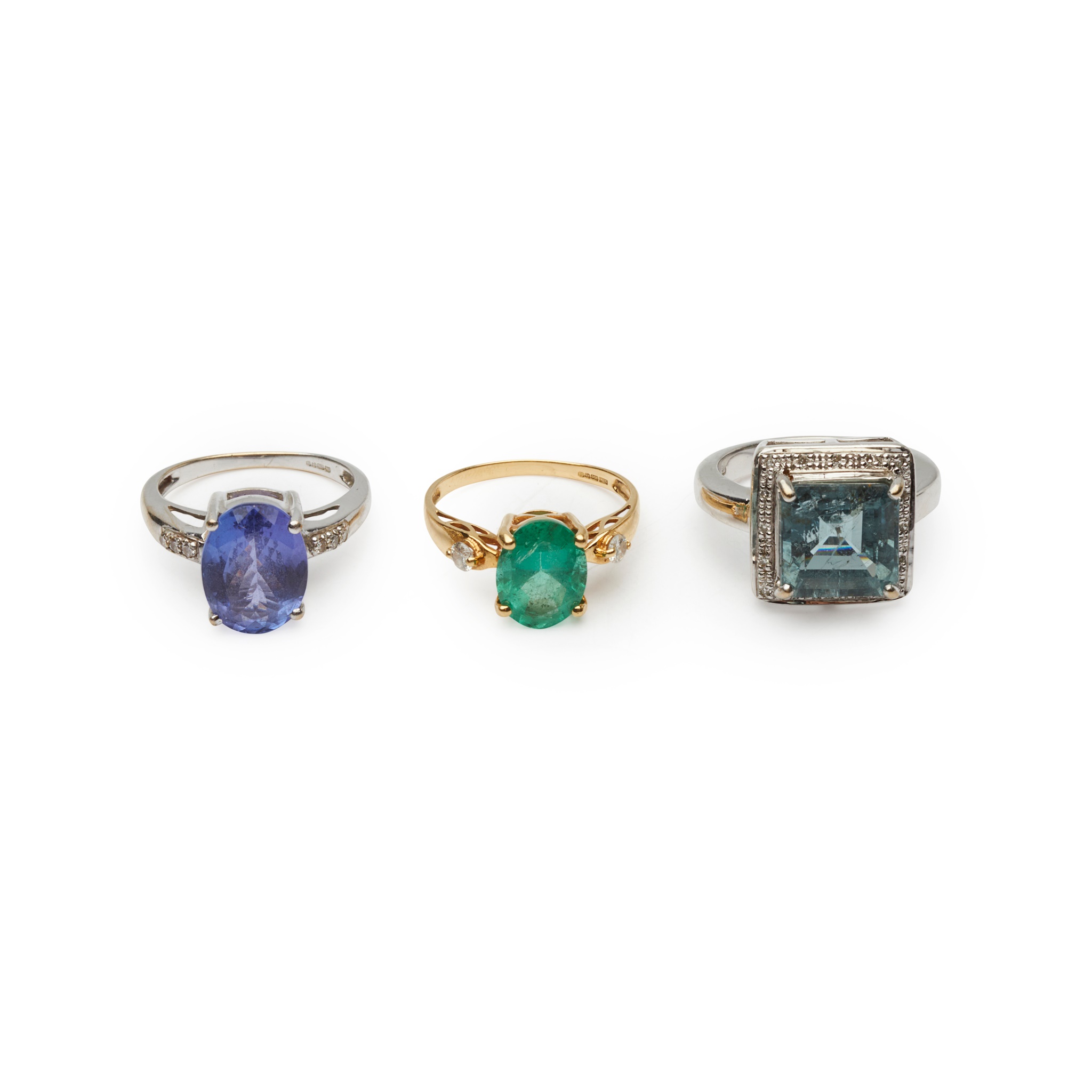 claw set with an oval-cut Tanzanite, each shoulder set with three round-cut diamonds, to a plain shank; together with an 18ct gold emerald and diamond set ring and an 18ct white gold tourmaline and diamond set cluster ring