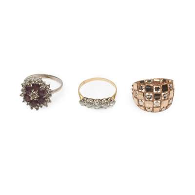 to include an 18ct gold ruby and diamond set cluster ring, to a plain shank; a five stone diamond ring, to a plain unmarked shank; and a broad 9ct gold ring with facetted finish