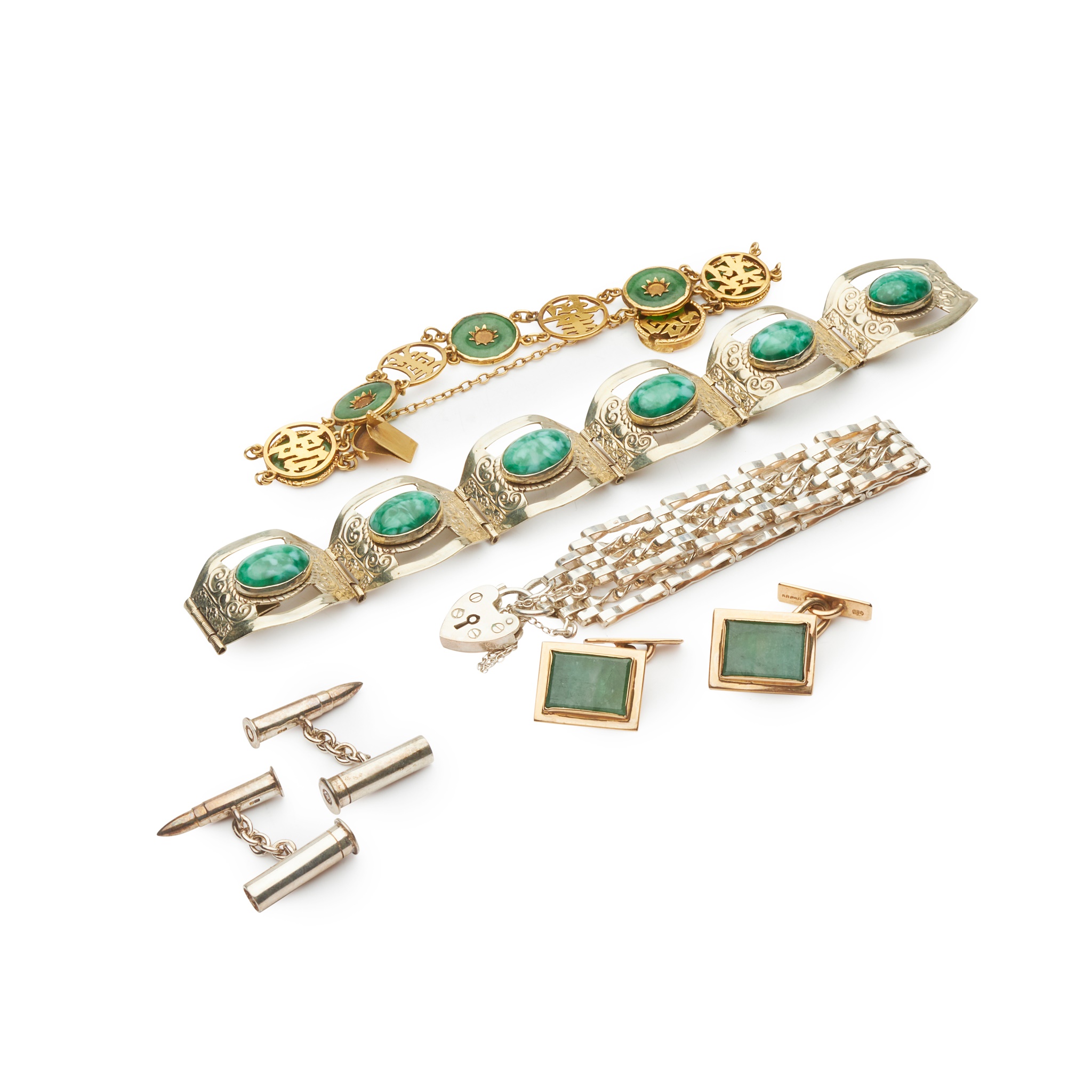 to include a pair of 9ct gold emerald set cufflinks, a Chinese jade set bracelet, with character mark links, stamped 18; a green hardstone set bracelet, stamped MEXICO; a silver gate link bracelet, a pair of silver 'bullet' cufflinks