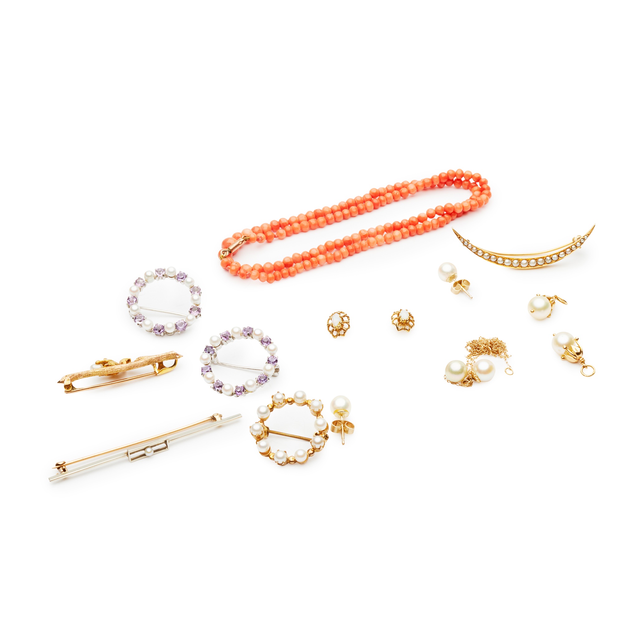 to include a pair of 9ct white gold amethyst and pearl circular brooches; a 9ct gold circular pearl brooch; a novelty bar brooch modelled as a squirrel on a branch, stamped 9ct; a seed pearl set crescent brooch, and another pearl bar brooch; a coral necklace, a pair of opal earrings and various cultured pearl pendants and earrings