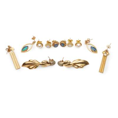 to include a pair of 9ct gold Ola Gorrie pendent earrings, a pair of diamond-set foliate style pendent earrings, unmarked; a pair of 9ct gold pearl stud earrings, a pair of opal and diamond cluster earrings and two pairs of opal triplet earrings