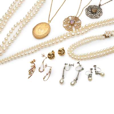 to include a 9ct gold locket and neck-chain, a pair of 18ct gold rope-twist earrings; a 9ct gold and amethyst Ola Gorie pendant necklace and chain, a pair of 9ct gold tri-coloured earrings, and another similar pair, unmarked; two pairs of faux-pearl pendent earrings; a silver and smokey quartz Celtic pendant, four cultured and faux pearl necklaces