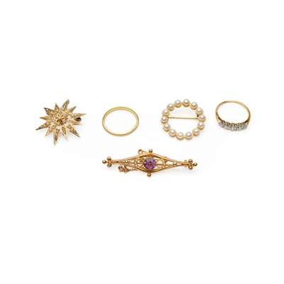 to include an 18ct wedding band; a five stone diamond ring, to an unmarked yellow metal shank; a cultured pearl brooch stamped 375; a 9ct gold seed pearl star brooch; an amethyst and seed pearl brooch, stamped 9ct