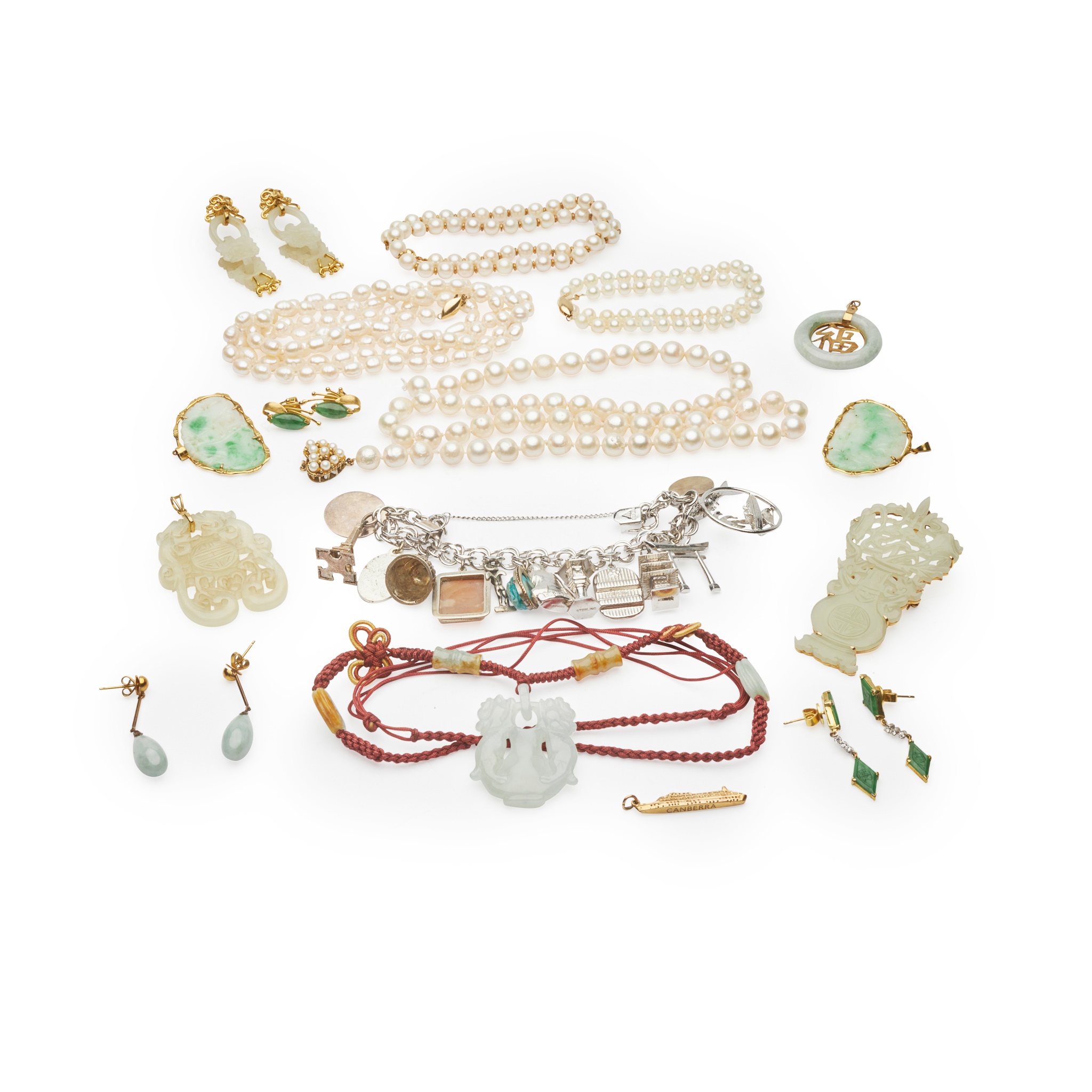 to include four cultured pearl necklaces, three pairs of gem-set pendant earrings; various jade and hardstone pendants, a charm bracelet etc.