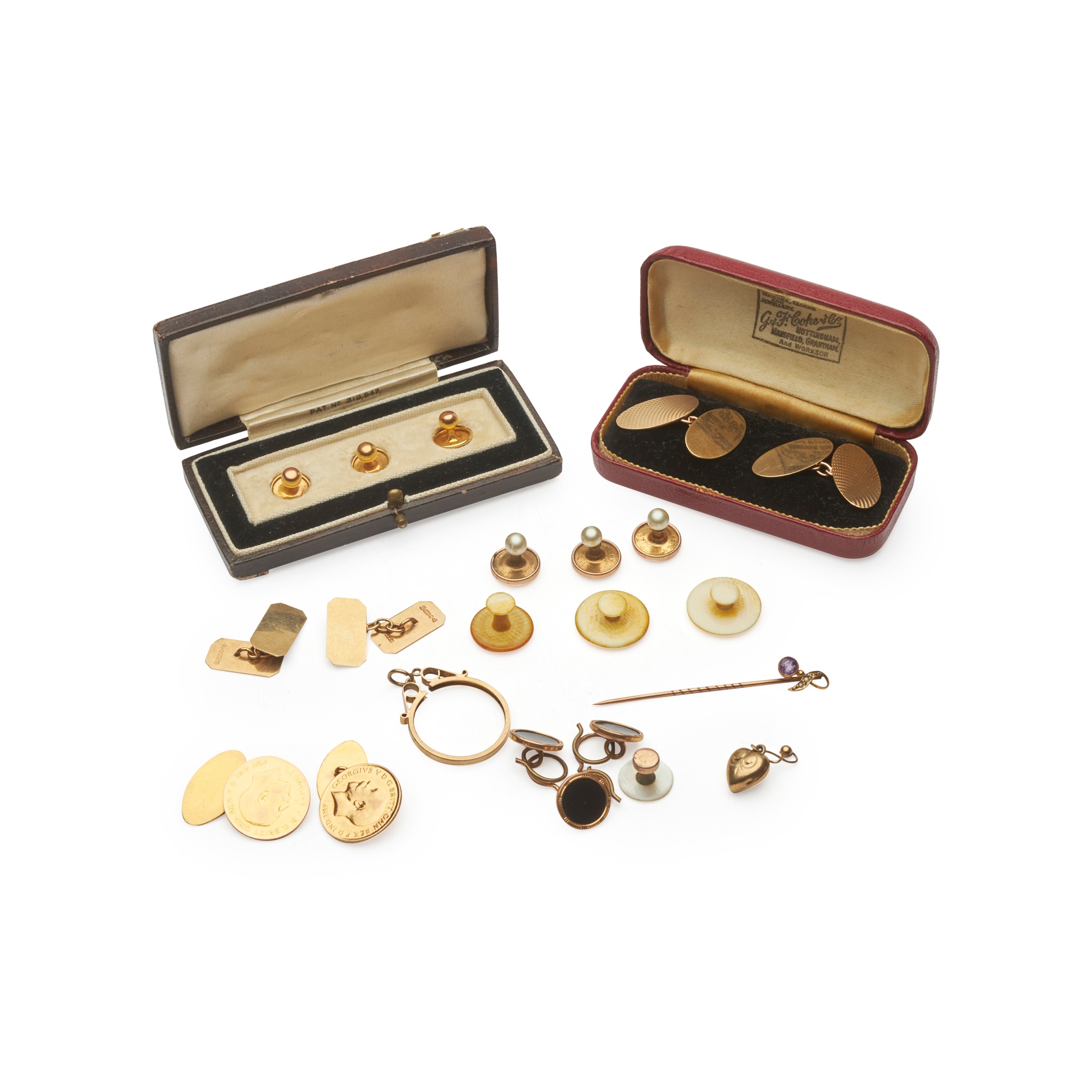 to include a pair of 1915 half sovereign cufflinks, two pairs of engined turned 9ct gold cufflinks; a cased set of three collar-studs, an amethyst and seed pearl set tie pin, and various other collar-studs, buttons etc.