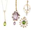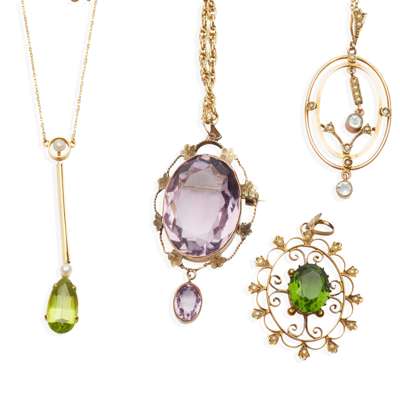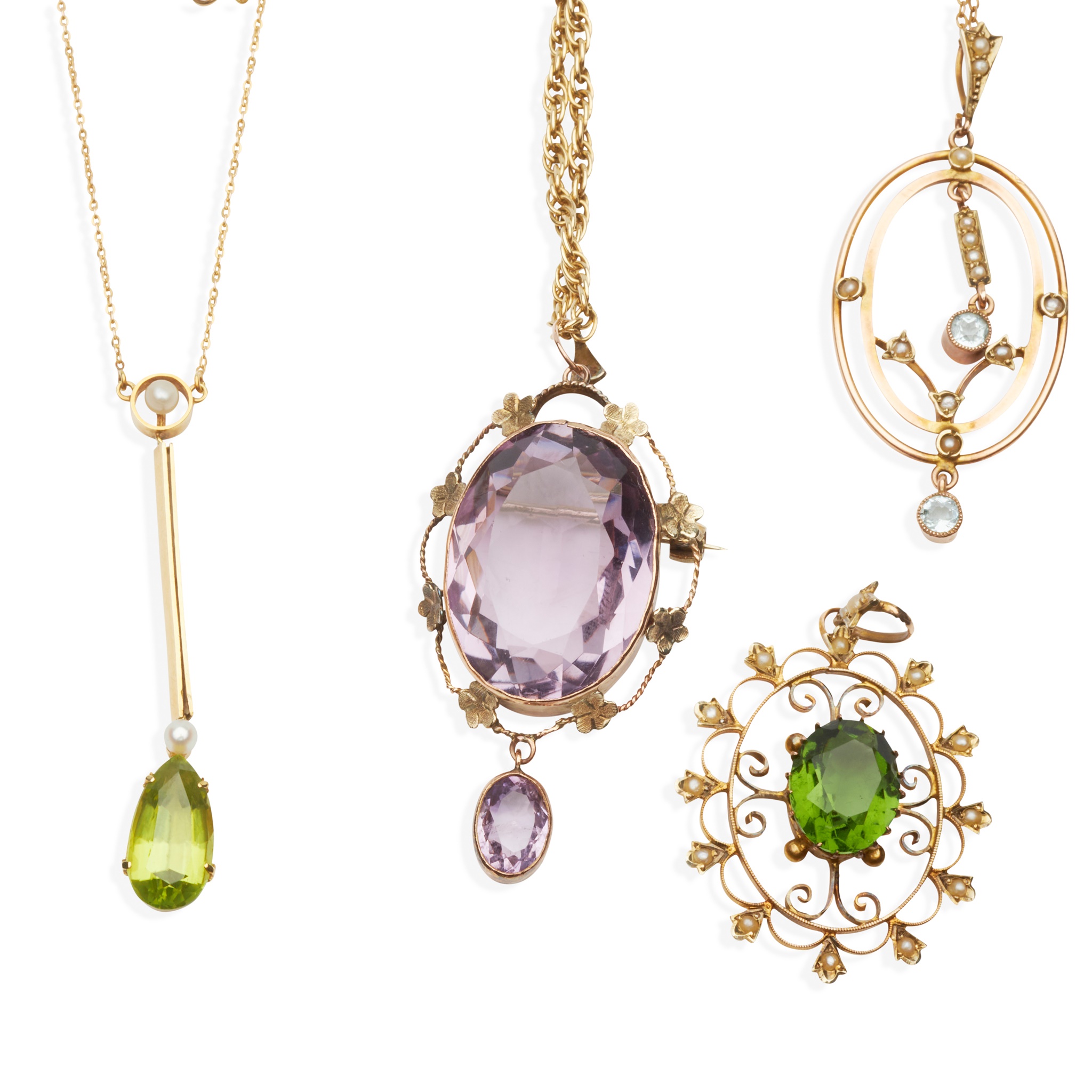 to include a Victorian amethyst pendant brooch, to a modern fancy link chain; a green paste and seed pearl pendant, an aquamarine and seed pearl pendant, and a peridot and seed pearl pendant