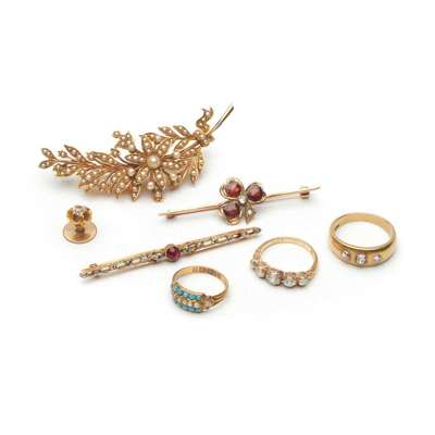 to include a pearl floral spray brooch, unmarked; a five stone diamond ring, stamped 18ct; a three stone gypsy set diamond ring, stamped 18ct; a 9ct gold turquoise and seed pearl ring, a diamond collar stud; a ruby and diamond bar brooch, a garnet shamrock brooch