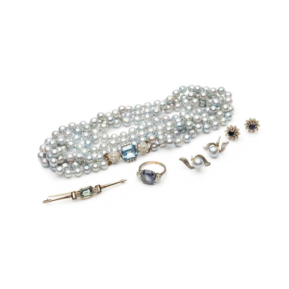 to include a two-strand cultured pearl necklace, to a diamond cluster and step-cut blue spinel clasp, unmarked; an aquamarine and diamond bar brooch, unmarked; a synthetic sapphire and diamond three-stone ring, a pair of sapphire and diamond set cluster earrings and a pair of cultured pearl set earrings
