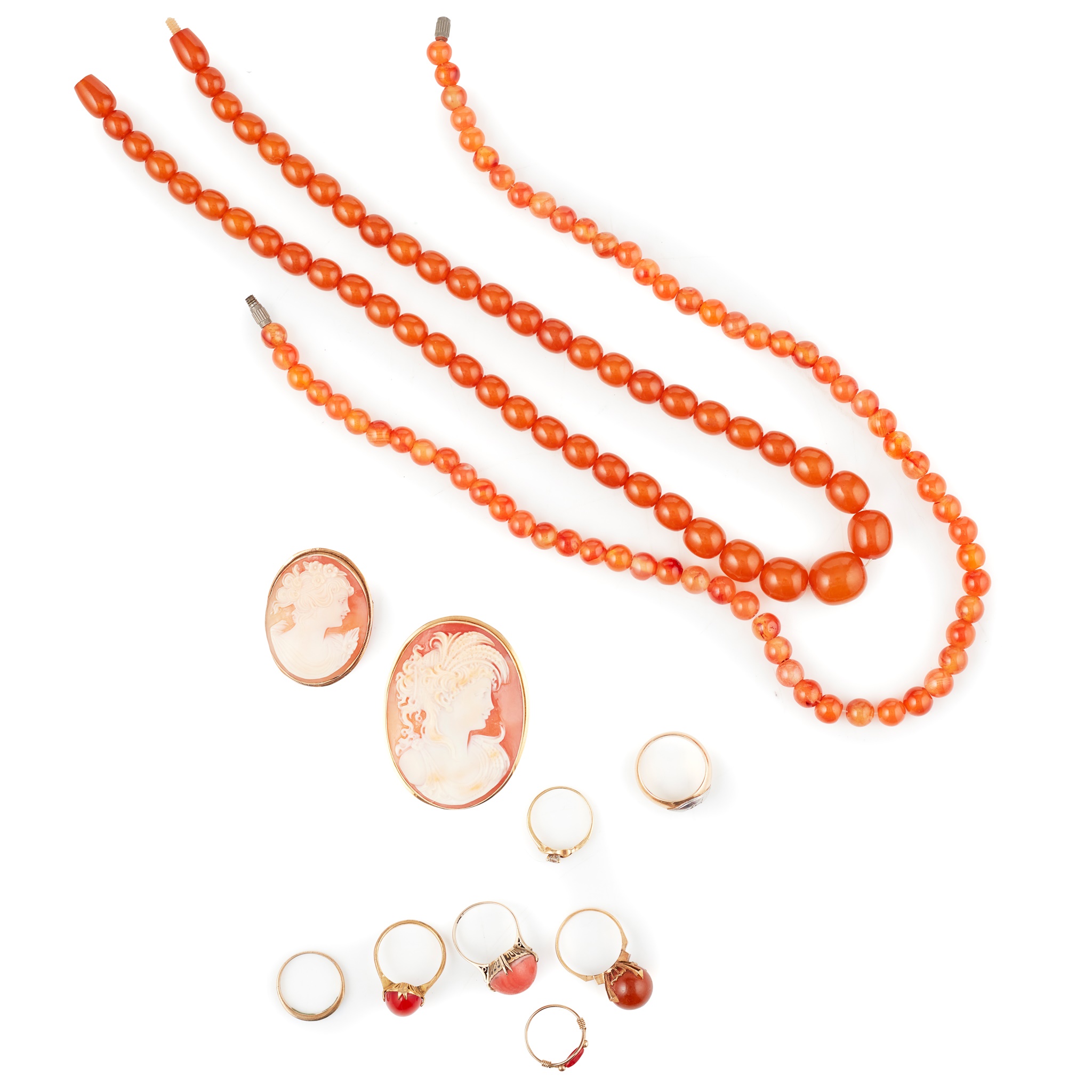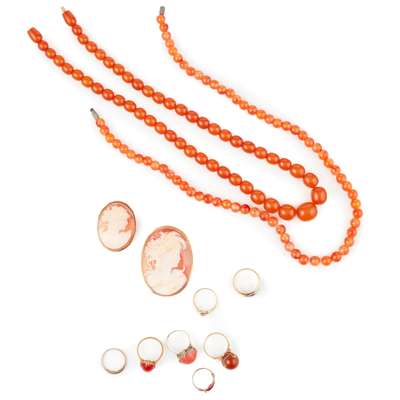 to include two cameo brooches, an amber bead necklace and a carnelian bead necklace; two diamond rings, various amber and coral rings