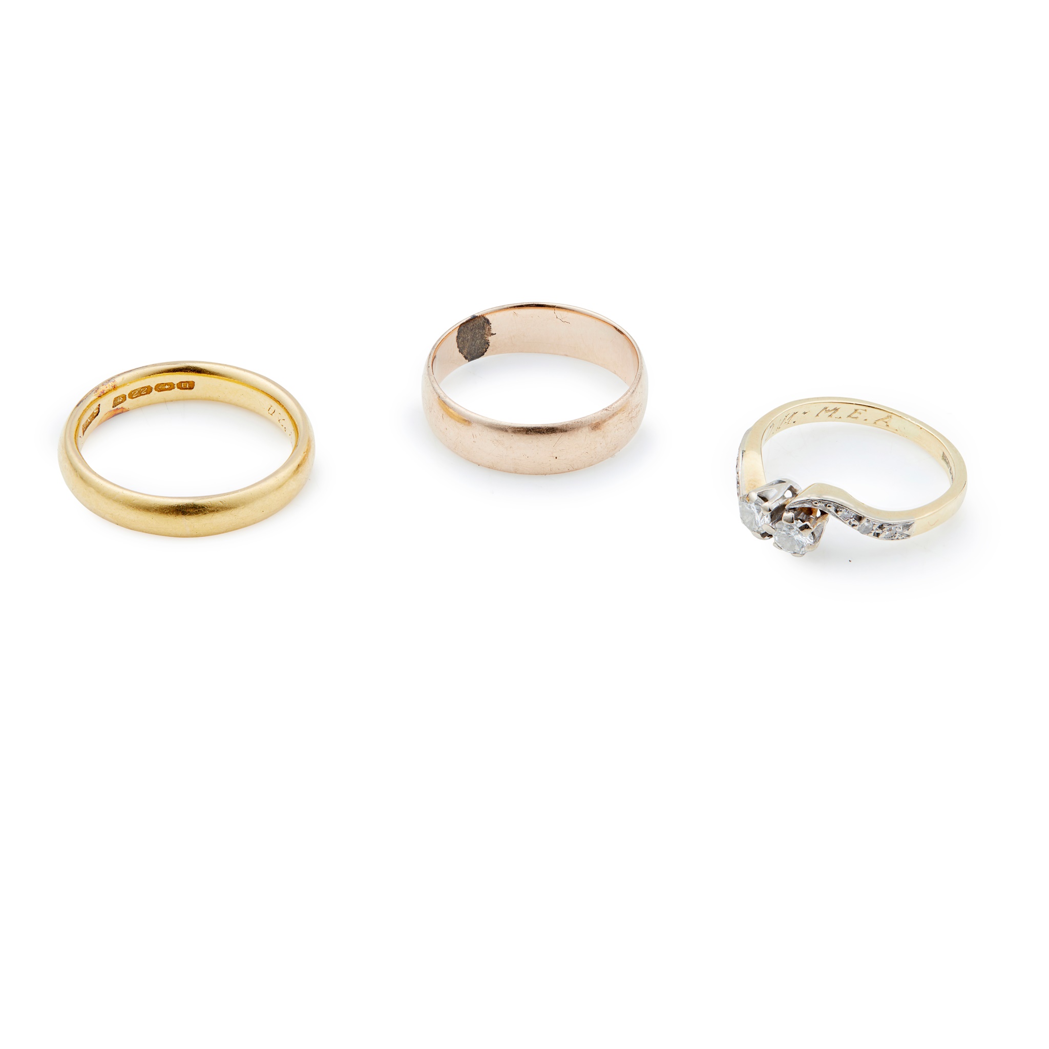 to include an 18ct gold two-stone diamond twist ring, a 22ct gold wedding band, and another wedding band, unmarked