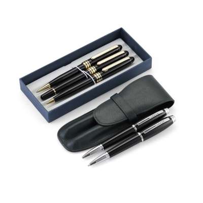 black polished case with white metal fittings in a leather pochette; together with a set of fountain pen, ballpoint pen and pencil black polished cases with gilt fittings