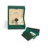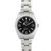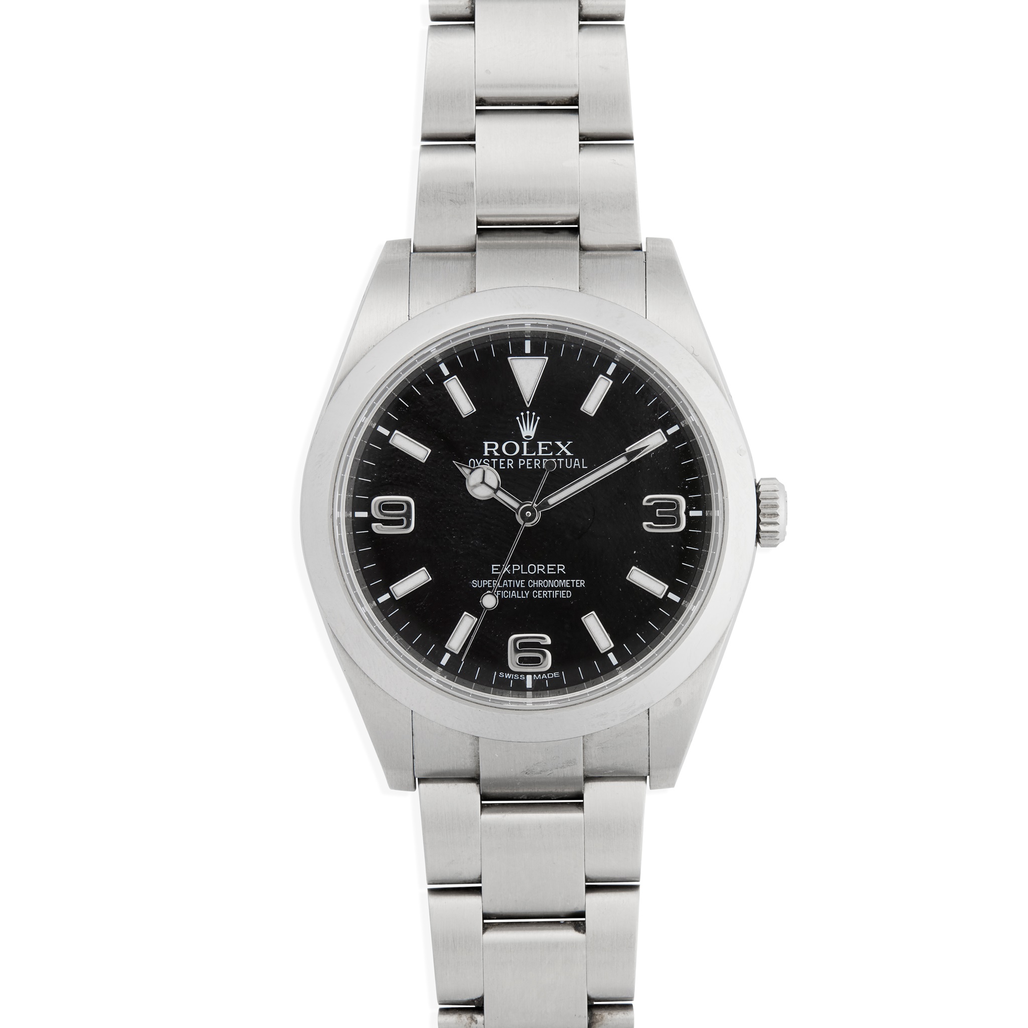 Oyster Perpetual Explorer model 214270 from between lugs and on guarantee card, 2015 from guarantee card, stainless steel case, automatic movement, round black dial with applied stainless steel 3, 6 and 9 and stainless steel-edged baton hour markers, lume-filled Mercedes hands, centre seconds hands with lume plot, outer seconds track in white, screw-down crown with coronet, on a stainless steel Oyster bracelet strap with Oysterlock clasp with X8R, in box, with outer box, with guarantee card, with swing tags, bezel guard and booklets