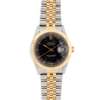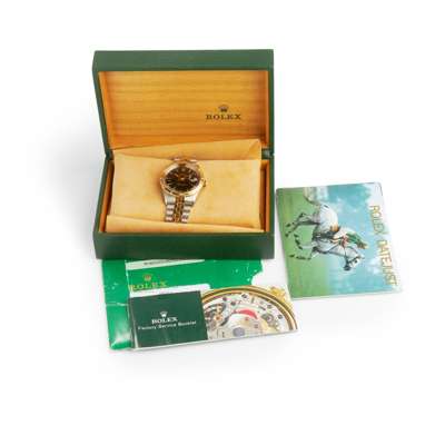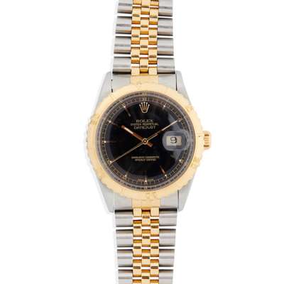 Oyster Perpetual Datejust model 16253 Turn-O-Graph 'Thunderbird,' 1986 from serial number, stainless steel case with automatic movement, round black dial with gold baton hour markers with lume plots below the outer edge, date aperture at 3, gold tapered lume hands, gold centre seconds hand, railroad outer seconds track in gold with Roman numerals, textured gold bezel with count up scale, screw-down gold crown with coronet, on a stainless steel and gold President bracelet with 455B to the end links, signed Rolex foldover clasp with micro-adjustment facility, with R8, 62523 H 18 to the interior, in box, with outer box, with papers and booklets, with service card dated 2011